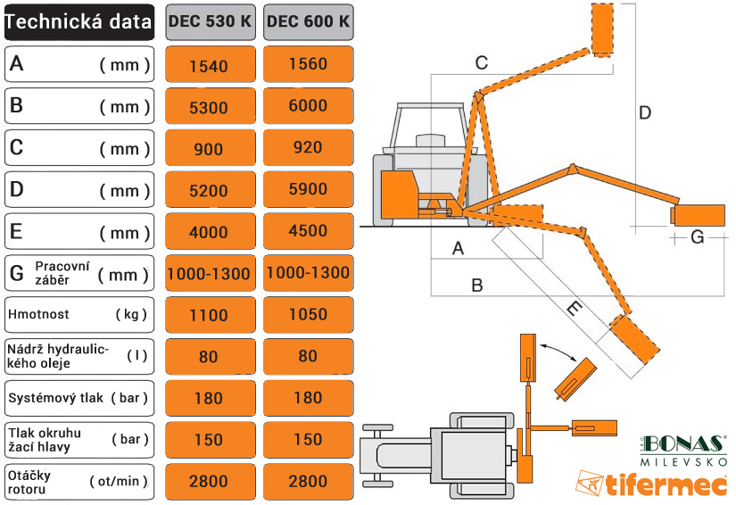 Ramenový mulčovač Tifermec série DEC-K s vyžínací hlavou s oběma smysly otáčení, zdvojeným hydraulickým systémem, dálkovým mechanickým ovládáním z kabiny traktoru a ochranou proti nárazu s automatickým návratem do pracovní polohy. Systém plovoucí polohy žací hlavy, výškově nastavitelný opěrný válec, čelní a zadní ochrany. Vyroben z vysoce kvalitních materiálů, zapoudřené broušené čepy.